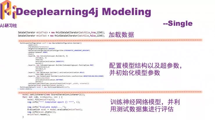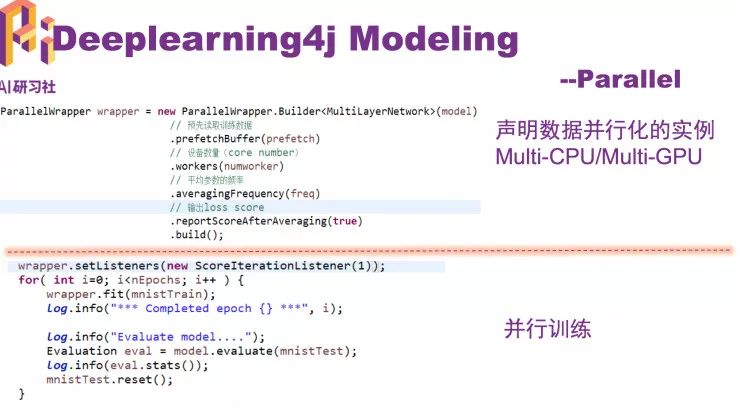 第三个部分怎么建模。分三个场景,第一个是本地单机建模;第二个是有多个CPU或多个GPU卡情况下怎么做并行建模;第三个是怎么和Spark结合做分布式的DL4j模型的建模。