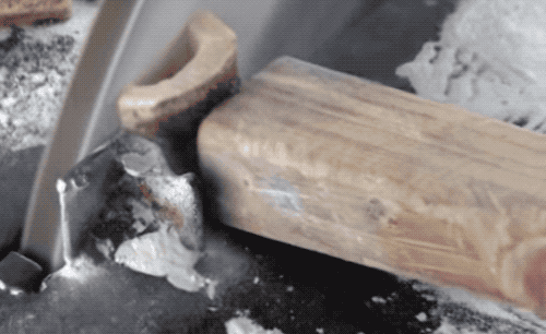 接着还要用一个高速下旋的砂轮,把凸面朝上的牛骨片给继续磨平整。