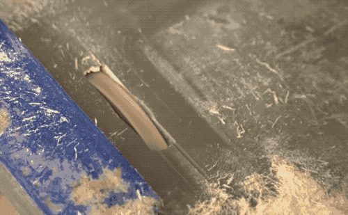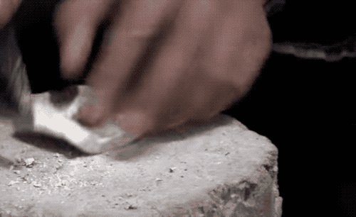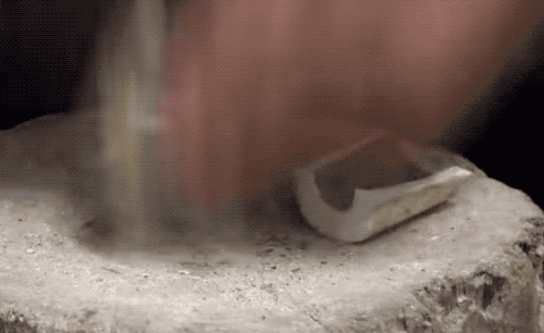 下一步是把弯曲的骨头弄得平整。把骨头的直边缘顶向砂轮,先是把凹面给磨平了。