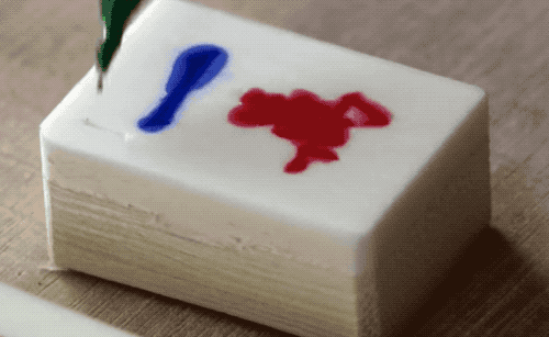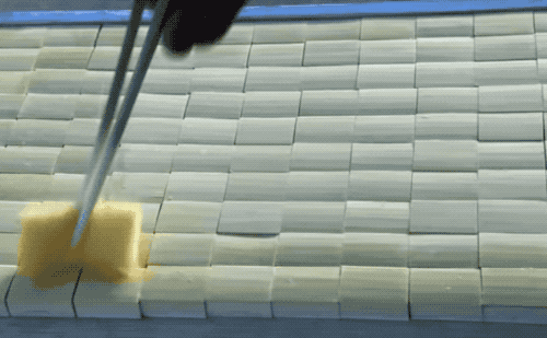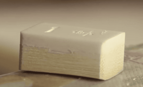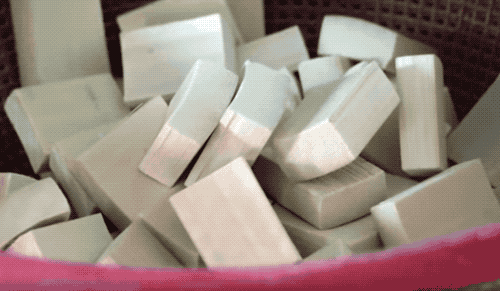 此时麻将的竹表面颜色还不是一致的,需要进行漂白处理统一下色号,让打麻将的时候没人能记住牌……下图就是用浸泡过强力漂白剂的海绵,对麻将的竹表面进行仔细擦拭。