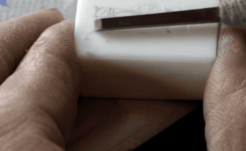 传统的手工麻将是不用胶水的,我们用的是中国传统工艺——榫卯结构。骨头片上有一个凸起,相应的竹片有一个凹进,然后把他们一契合就卡顿住了!下图是先做燕尾榫的凹面。
