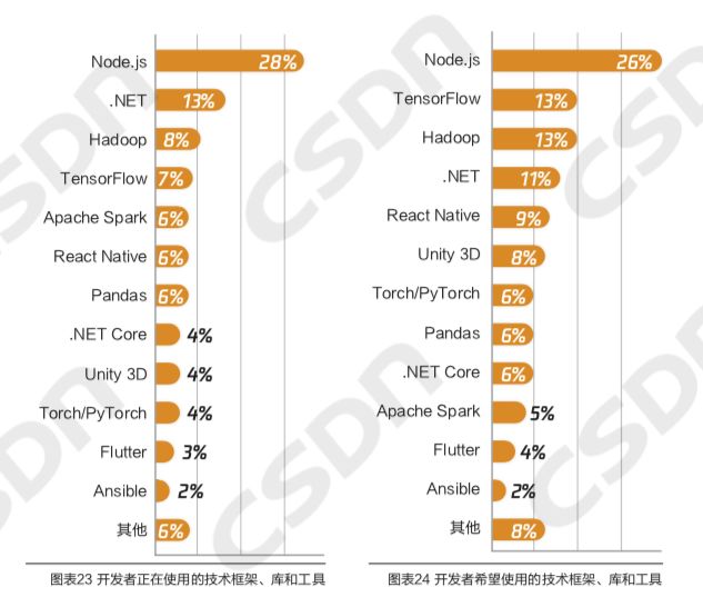 在使用普遍的技术框架中,Node.js遥遥领先,有28%的开发者正在使用,且有26%的开发者希望使用这个框架。