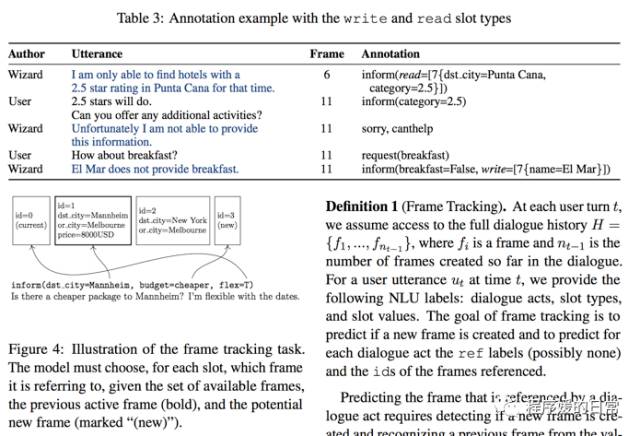 Frame 这个数据集之所以叫这个名字,主要是其论文中[4]提出了一种新任务,叫 Frame Tracking。区别于传统任务导向型对话中的 Dialogue State Tracking(DST)是以每个对话轮(turn)为粒度,Frame 相当于将对话切割成了更大更粗粒度的一个个小目标。以一个例子来说明,比如我们在定制一次旅行计划的时候,往往会很向对比很多个目标(酒店、机票、城市组合等),这些横向对比的小目标可能是在几个对话轮中都提到的,又可能在对话进行到后面的时候重新被提起(比如做横向比较的时候),那么这些时候就会涉及到 frame refering 的问题。