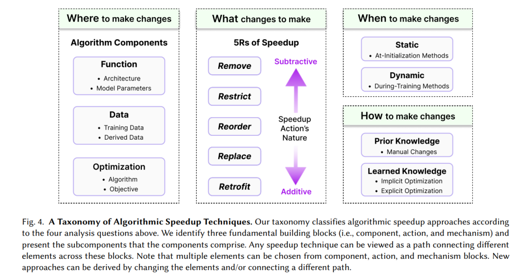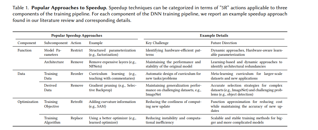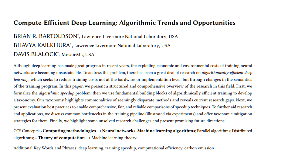 在过去的几年里,深度学习(DL)在广泛的应用领域取得了显著的进展,如蛋白质结构预测(AlphaFold [Jumper et al。2021])、文本到图像合成(DL - e [Ramesh et al。2021])、文本生成(GPT-3 [Brown等人。2020a])等。实现这些性能提升的关键策略是将DL模型扩展到非常大的规模,并对它们进行大量数据的训练。对于大多数应用程序,可训练参数的数量至少每18至24个月翻一番——语言模型以4至8个月的翻倍时间领先(Sevilla and Villalobos 2021)。大规模人工智能模型的著名例子包括:用于视觉应用的Swin Transformer-V2 [Liu等人2022a],用于语言建模的PaLM [Chowdhery等人2022],用于内容推荐的波斯[Lian等人2021],具有100万亿参数。尽管扩大DL模型正在实现前所未有的进步,但训练大型模型已经变得极其昂贵。例如,GPT-3训练成本估计为165万美元,使用谷歌v3 TPU[Lohn和Musser 2022],且transformer 模型的低效/幼稚开发将产生相当于5辆汽车终生碳足迹的二氧化碳(CO2) [Strubell等人,2019]。值得关注的是,DL仍然没有达到许多应用所要求的性能水平:例如,在现实世界中部署全自动驾驶汽车需要人类水平的性能,但还没有达到。不断增长的模型和数据规模以达到所需的性能将使当前的训练策略在金融、环境和其他方面不可持续。事实上,根据目前的趋势推断,2026年最大的人工智能模型的训练成本将超过美国的GDP总量(Lohn and Musser 2022)。此外,DL对计算的高度依赖引发了人们对财务资源有限的用户(如学者、学生和研究人员(特别是来自新兴经济体的人)的边缘化的担忧[Ahmed and Wahed 2020]。我们将在附录A中更详细地讨论这些关键问题。考虑到其计算负担的不可持续增长,DL的进步需要更多的计算效率训练方法。一个自然的方向是消除学习过程中的算法效率低下,以减少DL训练的时间、成本、能量和碳足迹。这种算法高效的深度学习方法可以通过多种方式改变训练过程,包括:改变数据或样本呈现给模型的顺序;调整模型的结构;改变优化算法。这些算法改进对于实现有效深度学习训练所需计算负担的估计下界至关重要,目前的做法导致的负担大大超过了该下界[Thompson等人,2020]。此外,这些算法增益与软件和硬件加速技术相结合[Hernandez和Brown 2020]。因此,我们相信算法高效的逻辑学习提供了一个巨大的机会来增加逻辑学习的收益并降低其成本。虽然最近涌现的算法效率论文支持了这一观点,但这些论文也表明,算法效率方法的研究和应用受到碎片化的阻碍。不同的指标被用来量化效率,这产生了不一致的加速方法的排名。评估是在狭窄或特征不佳的环境中执行的,这将导致不正确或过于宽泛的结论。在讨论算法效率方法时,缺乏反映它们的广度和关系的分类法,这使得人们很难理解如何遍历加速环境,将不同的方法结合起来并开发新的方法。因此,本文的核心贡献是组织算法效率文献(通过受[Von Rueden等人2019]启发的分类法和调研),以及对影响报告和实现加速的实际问题的技术描述(通过评估和实践指南)。我们的讨论始终强调这两个重点的关键交集:例如,算法效率方法是否会导致实际的加速确实取决于方法(通过我们的分类法可以理解)和计算平台(通过我们的从业者指南可以理解)之间的交互。我们的贡献总结如下: