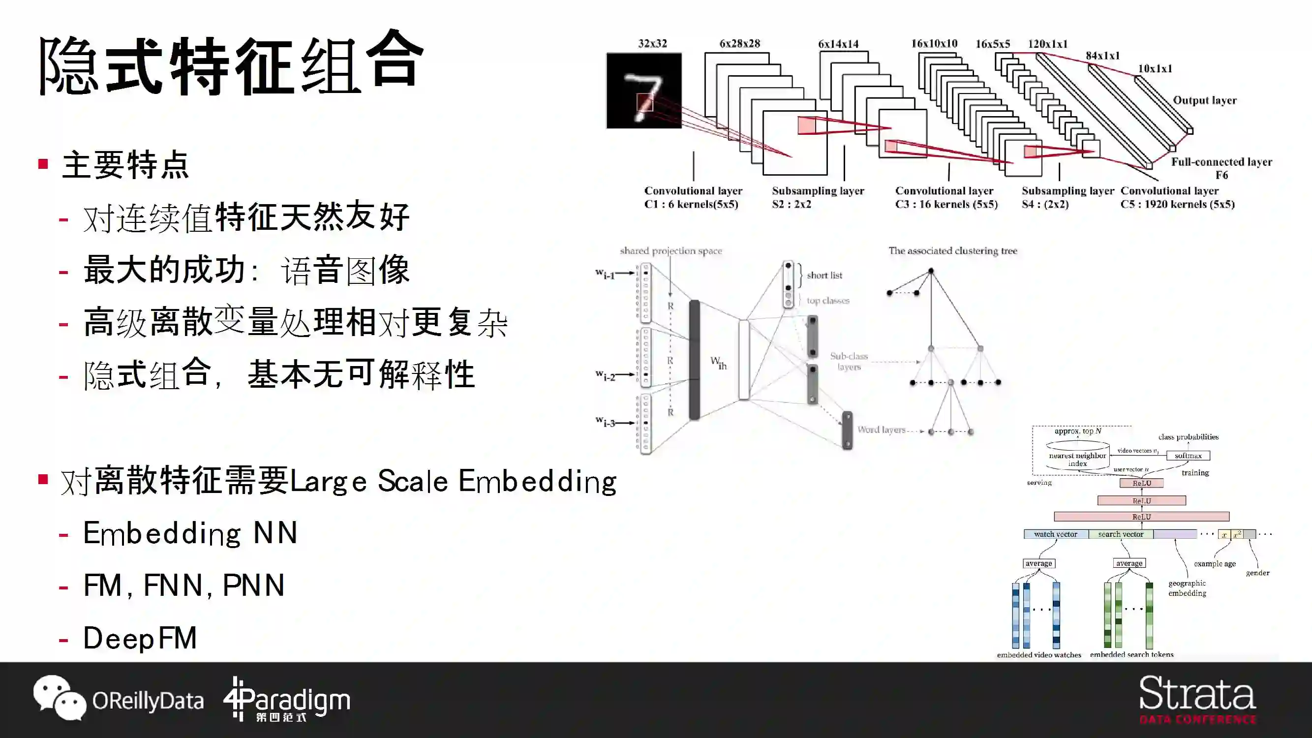 隐式特征组合主要特点是对连续值特征非常友好,最成功的应用场景是语音和图像。在这些原始信号是像素或是声波的问题里面,深度学习通过神经元网络产生底层的Filter以及层次化的特征组合,获得了远超人类手工特征工程的效果。但是深度神经网络并不是万能的,在深度学习中,高维离散特征的变量处理非常复杂,同时缺乏可解释性,过于黑盒化也是神经网络大家关注的焦点。这样会导致深度学习出来的特征组合相对难用到其他算法之上,也很难给人明确的信息反馈。