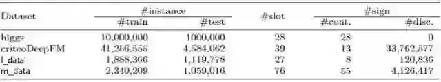 我们在4个数据及上实验了FeatureGO算法,包括两个公开的数据集(higgs、criteoDeepFM)与两个我们私有的数据集(l_data,m_data),数据集统计信息如下: