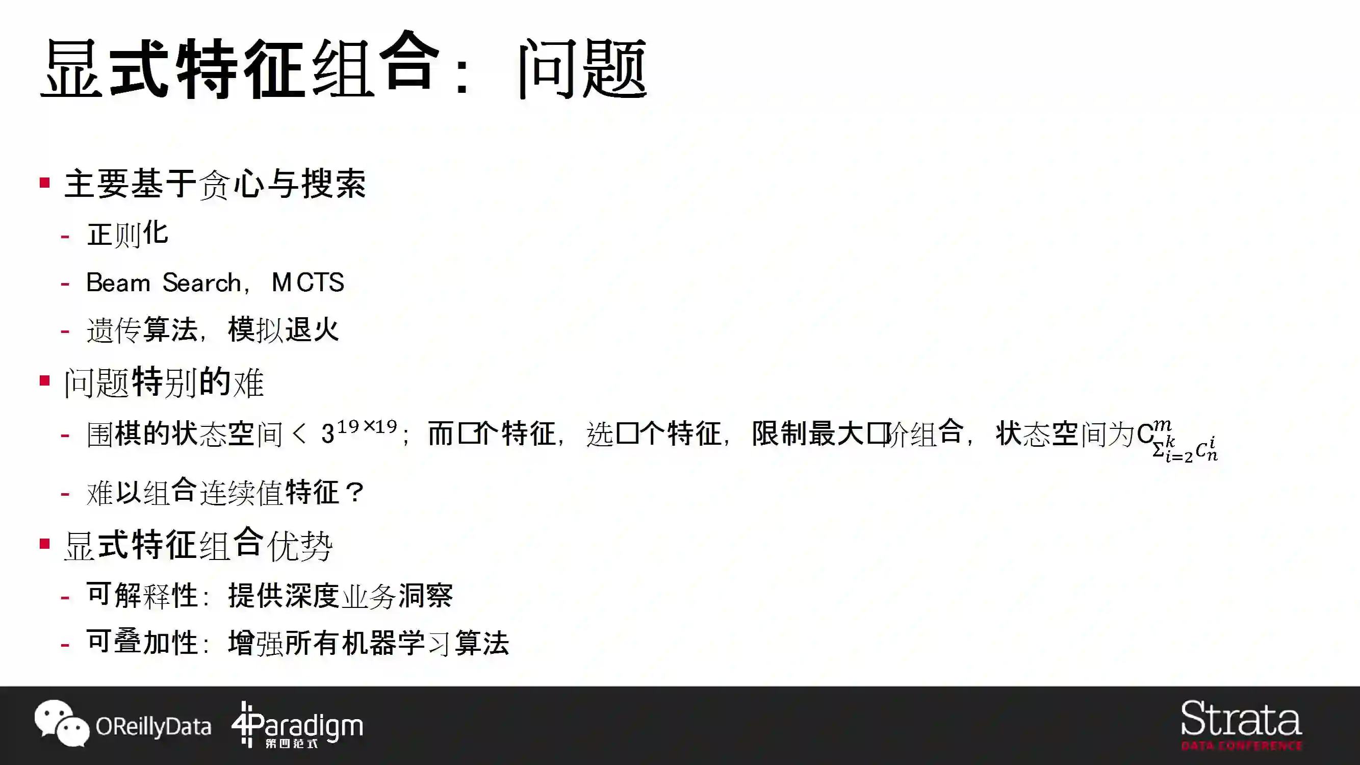第三个介绍一下显式的组合,算法的输出会明确指定哪些特征组合起来(笛卡尔积)作为基础特征。整体思路沿着搜索与搜索优化这条路,也有一些地方使用正则化加贪心。由于显式特征组合的问题求解空间大,寻找最优特征组合是个非常难的问题。我们对比AlphaGo下围棋,19乘19的棋盘上每个点上有黑子/白子/无子三种状态,它的状态空间最大是3^(19×19)。考虑显式特征组合要做的事情,我们要有n个特征,限制高阶组合阶数不超过k,从中选取m个特征,那么2到k特征的总量是∑_(i=2)^k▒C_n^i ,最终再从其中选取m个特征,其空间是 ,即使将不大的n,m,k中带入,量级会远远大于3^(19×19),从解空间大小的角度看显示特征组合比下围棋还要更难。