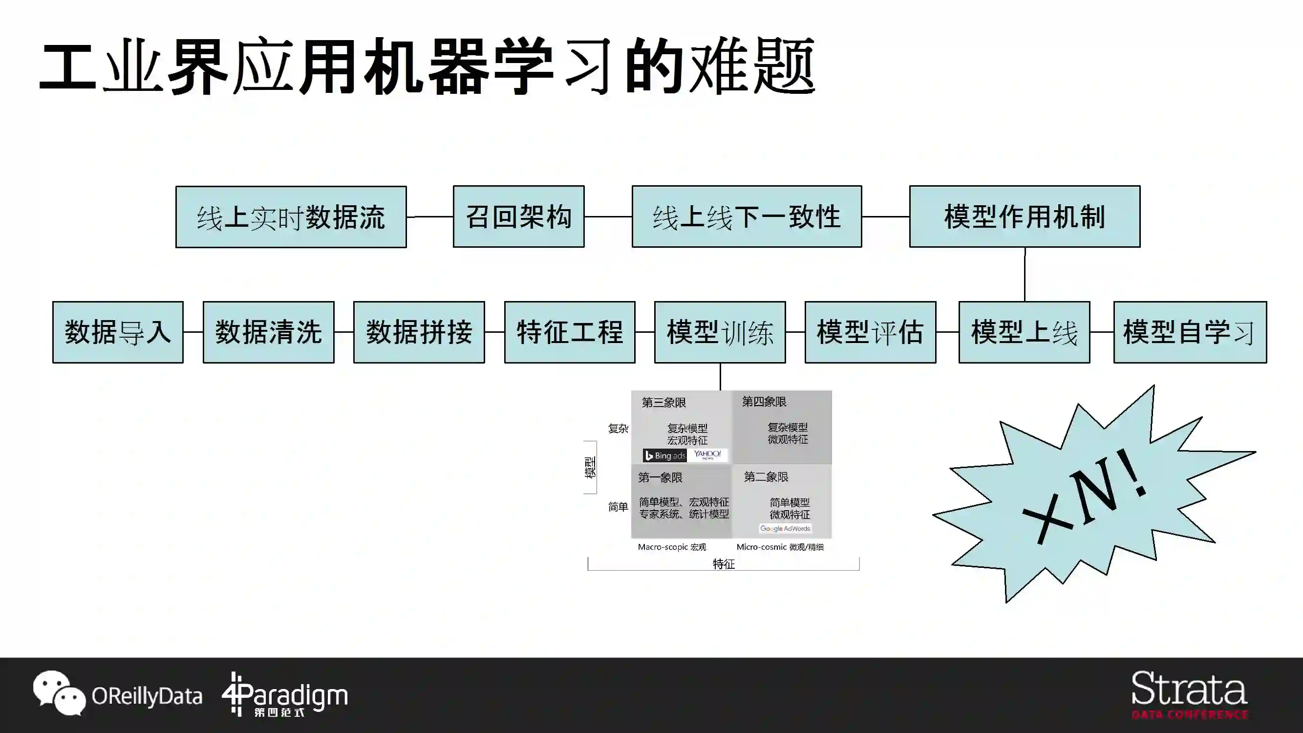 这样就把人工智能分为了四个象限。如上图,左下角是第一象限,使用宏观特征简单模型解决问题。这种模型在工业界应用非常少,因为它特征数少,模型又简单,VC维就是低的,不能解决非常复杂的问题。右下角的第二象限是简单模型加上微观特征,最有名的就是大家熟知的谷歌Adwords,用线性模型加上千亿特征做出了世界顶尖的广告点击率预估系统。左上角的第三象限是复杂模型加宏观特征,也有诸多知名公司做出了非常好的效果,例如Bing广告和Yahoo,经典的COEC+复杂模型在这个象限内是一个惯用手段。最后是第四象限,利用复杂模型加上微观特征,由于模型空间太大,如何计算以及解决过拟合都是研究的热点。