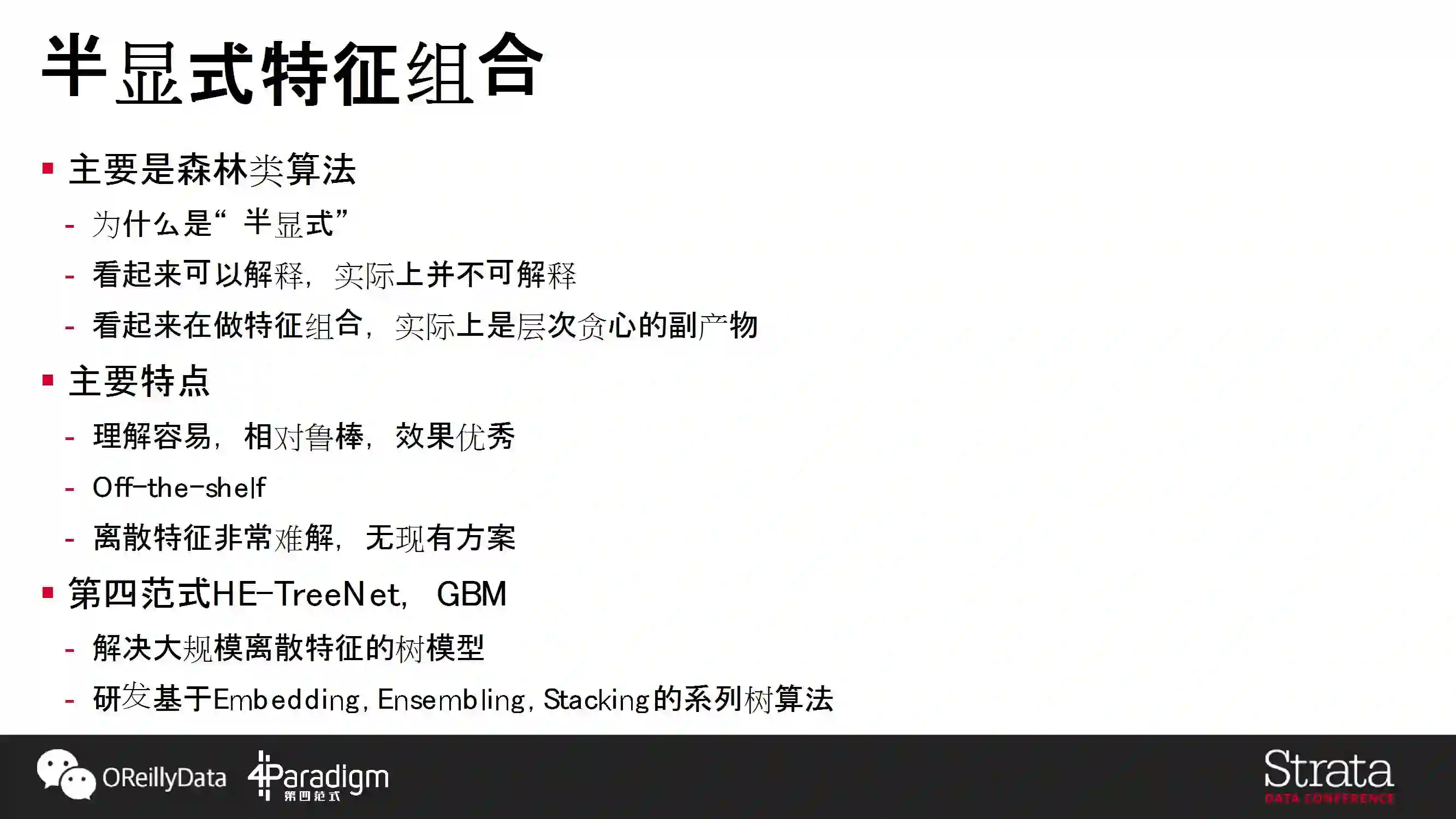 第二个是半显式的组合,主要基于的是树模型。为什么说是“半显式”呢?因为大家可能认为树模可解释或者做特征组合是很自然的事情,但其实并不是:叶子节点的每一个分支并不是一种显式、直接的特征组合,而是这些特征在特定取值区间的组合。所以从结果上来说我们做到了特征组合,有一定可解释性,但是同样也没有办法直接看特征相关性或者特征之间组合关系。作为非线性模型,树模型主要的特点是容易理解,效果也是非常好的。但是类似的,它对离散的精细特征非常难处理,传统上训练一棵m个特征n个训练数据k层深t棵树的模型需要O(mntk)的时间,即使对系数特征进行优化,也很难降低特征分裂中分桶上的空间与传输消耗。在这个方面,第四范式提出了一系列算法,包括HE-TreeNet和GBM系列算法,通过Embedding,Ensemble、Stacking,General Boosting等方式让树模型可以在大规模特征的情况下可以进行特征组合。
