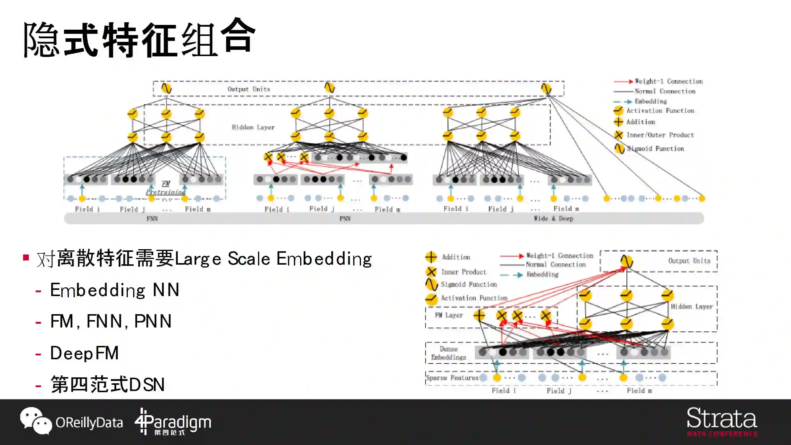 Large Scale Embedding在现在依然是一个比较热门的研究领域,其中的成果包括Discrete Factorization Machine, FNN, PNN, DeepFM等,上图显示了这些算法的异同,简单来讲这些模型既能找到特征之间的推理关系,同时也能去记忆比较细的特征。在这个领域,第四范式提出了DSN(Deep Sparse Network)的算法,它是一个非常宽且深的模型,里面同样会做大规模Embedding,用神经网络做自动学习组合,目标解决高维模型(上万万亿VC维度)的正则化以及并行计算问题。