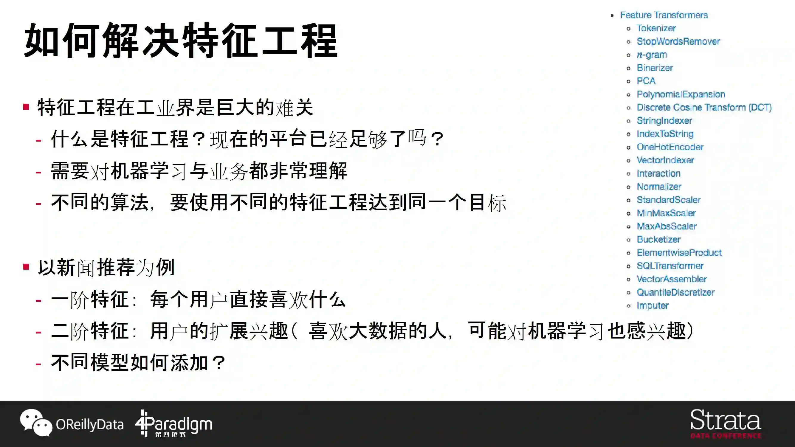 如何降低这些门槛呢?这里分享一下第四范式的成果。首先特征工程是工业界应用AI的巨大的难关。特征工程的目标是针对于某个模型找出与要解决问题相关的关键属性,现在也有一些开源的项目尝试解决特征工程,下图就列出了Spark 2.2官方文档中包含的特征工程算法。那么,针对不同的业务、不同的模型,这些算子就足够我们低门槛建模了吗?
