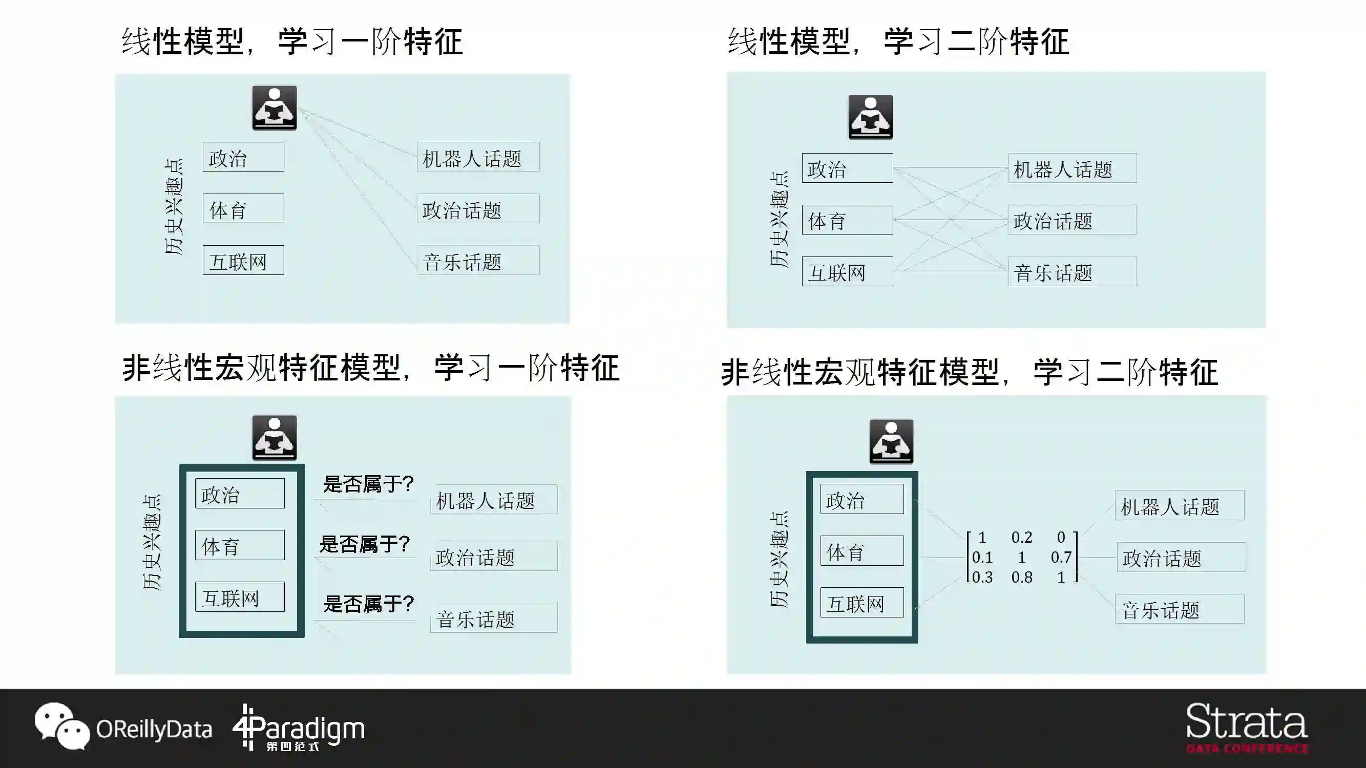 那么,如果我们要学习二阶特征呢?对于线性模型(如右上角所示),我们也需要用到用户的历史兴趣点,将用户的历史喜好与文章的话题进行组合(User_Topic-New_Topic),这样模型就可以学到历史上喜欢什么样话题的人还会喜欢什么样的新闻话题,达到二阶迁移的目标。对于非线性模型(如右下角所示),我们要做的将原先的一阶逻辑判断(可以认为是个Identity矩阵)变成一个二阶状态转移矩阵,通过历史统计得知不同话题间喜欢转换的情况,推算出一个不在用户现有兴趣点中的文章话题是不是用户喜欢的。