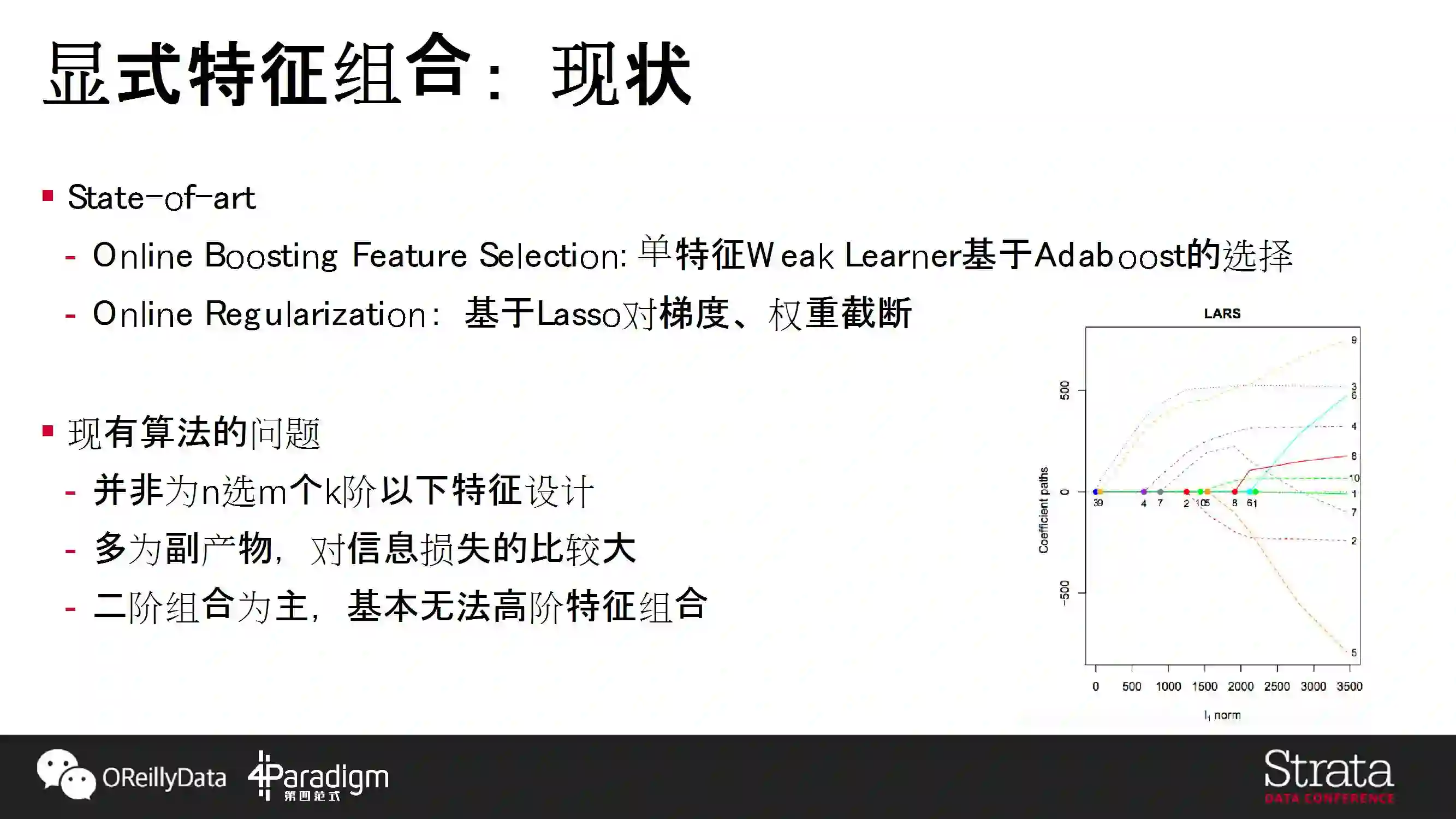沿着特征走主要是由工业界来主导,比如说谷歌的Adwords里面有上千亿的特征,想要描述为什么会产生一次广告点击,这就需要解决高效并行的问题。这些技术大部分进展来自于KDD或是WWW。沿着特征优化机器学习,就是把问题通过特征的方式分的足够细,做非常准确的模型。