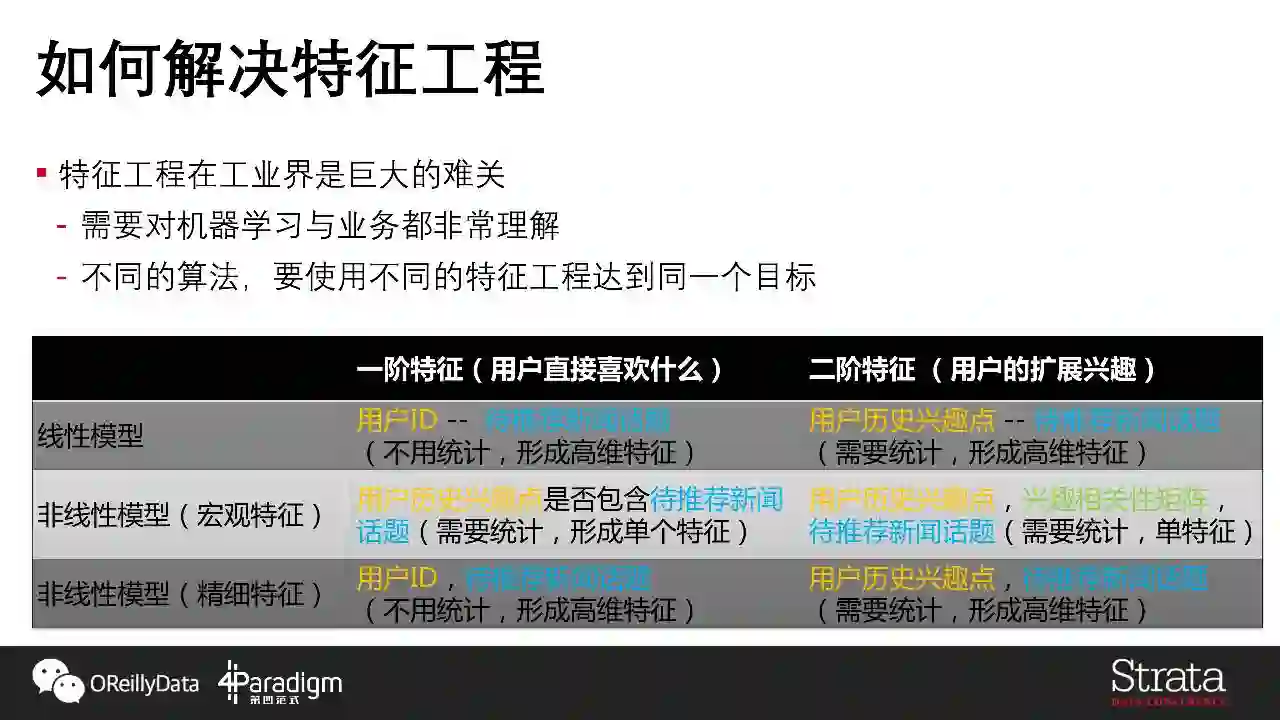 特征共分两种,一种叫宏观特征,比方说年龄、收入,或是买过多少本书,看过多少部电影。另外一种是微观特征,指的是比拟细粒度的特征,你具体看过哪几本书,或者具体看过哪几部电影。每一部电影,每一本书,每一个人,都是不同的特征。书有几百万本,电影有几百万部,所以这样的特征量非常大。