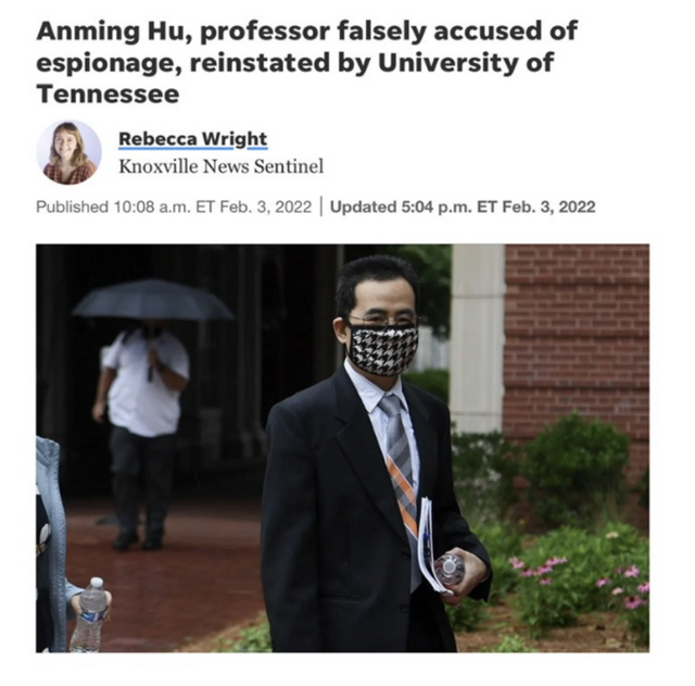 2022年,田纳西大学诺克斯维尔分校(The University of Tennessee at Knoxville)表示恢复了胡安明教授的的终身教职。