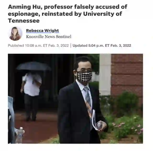 2018年4月,当时田纳西大学的华裔教授胡安明接到了来自美国联邦调查局(FBI)探员的“拜访”。