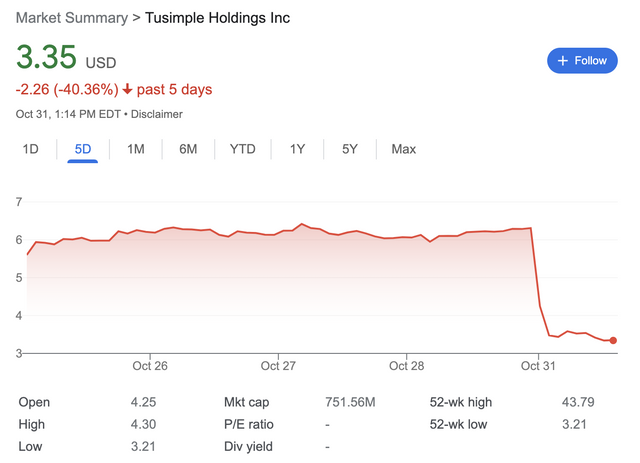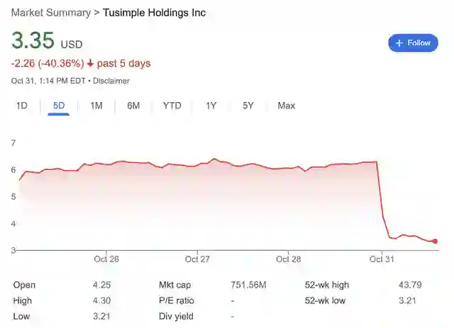 截止发稿前,无人驾驶卡车公司图森未来(TuSimple,股票代码为:“TSP”)重挫40.36%。