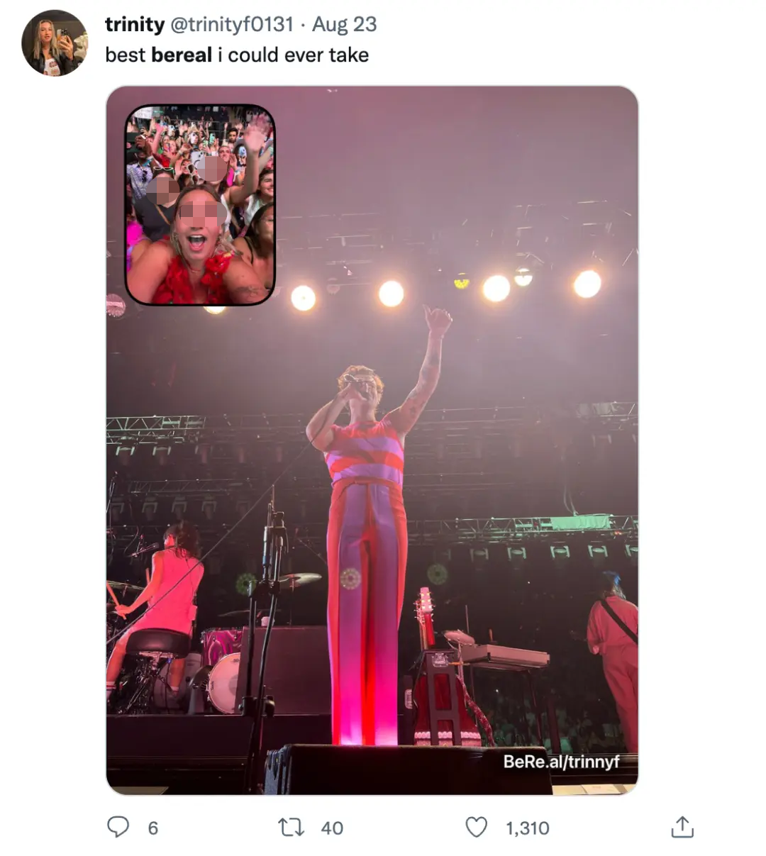 有用户在Twitter上放出自己的BeReal照片。他们利用双摄像头同时拍照的功能让自己和舞台上的偶像轻松同框,