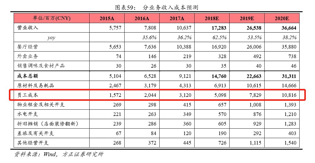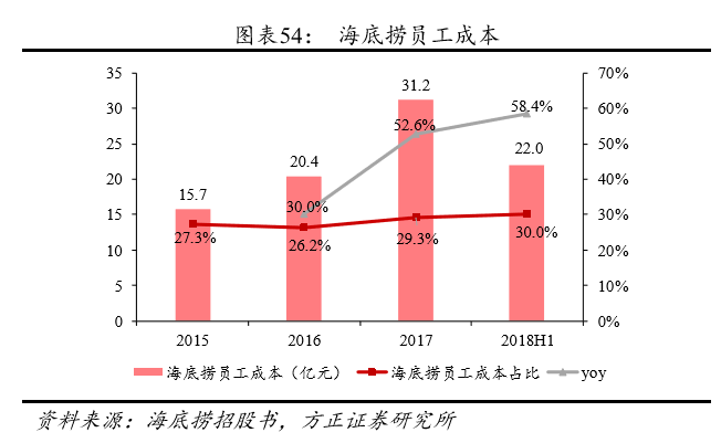 据财报显示,员工成本一直是海底捞的重要成本项,占比高达30%。即使其扩门店不断渠道下沉,也没有下降,反而呈现出逐年递增的态势。