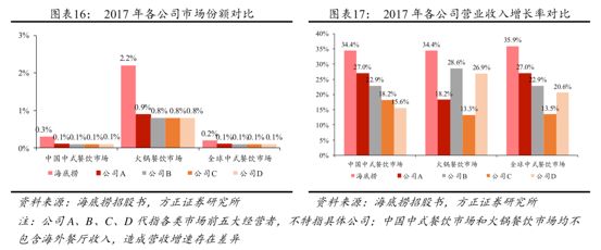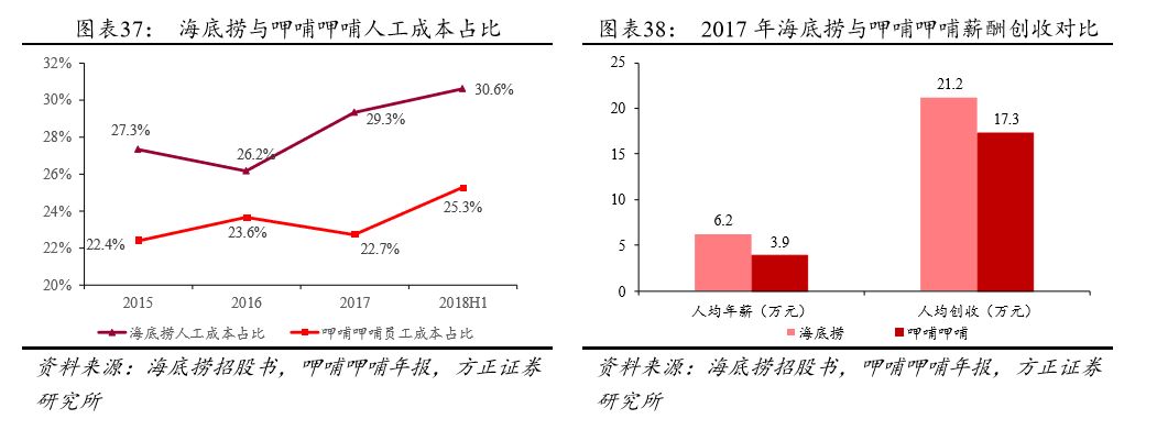 虽然海底捞的员工薪酬要比呷哺呷哺高60%,但“物有所值”,高员工成本也为其创造了丰厚回报,2017年海底捞人均创收为 21.2 万元,优于呷哺呷哺的 17.3 万元。