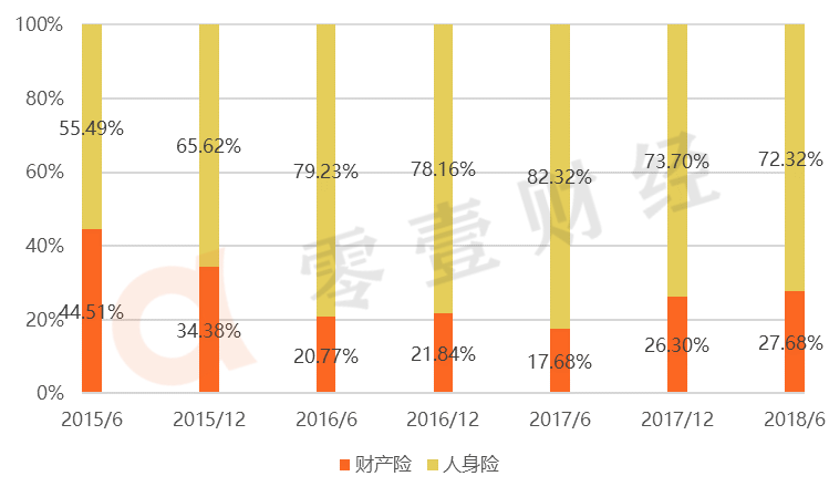 2015H-2018H,互联网保险业务中,人身险为互联网保险收入的主要构成一般在七成左右(见图2)。