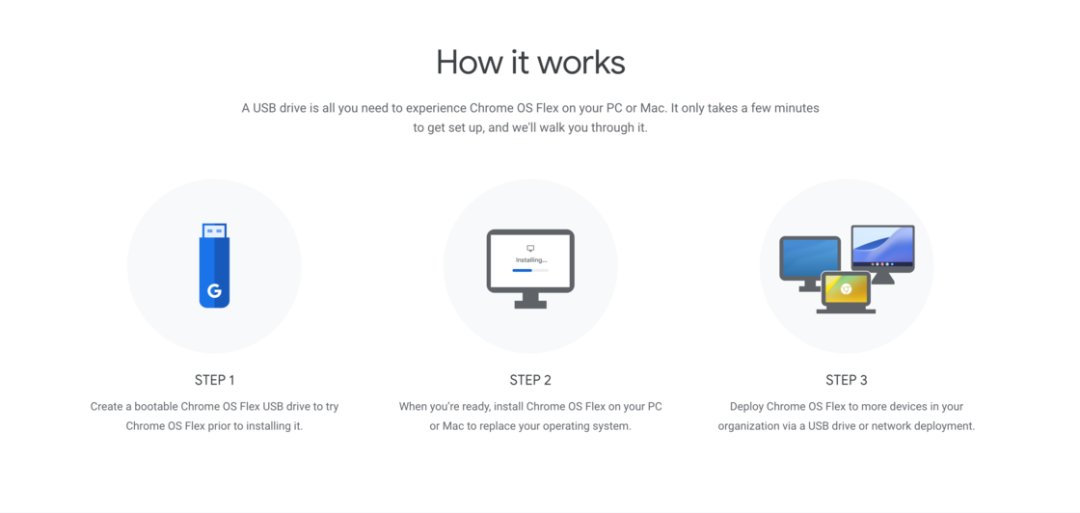 即便没用过,你大概也会在近几年的各种报道中听闻过 Chrome OS 的名字:它是 Google 基于 Chrome 浏览器生态开发的轻量级云端操作系统,2020 年市场份额甚至还超越了 macOS 成为第二大操作系统。加上后续对 Android、Linux 应用运行环境的支持,对大多数国内用户而言还比较陌生的 Chrome OS,事实上也已经成为了一个成熟的桌面端操作系统。今年 2 月,Chrome Enterprise 团队发布了面向 Windows/macOS/Linux 设备、可以快速刷入的 Chrome OS 系统分支 —— Chrome OS Flex。作为一项拥有 Chrome OS 官方支持的「刷机」服务,除了轻量级的特征之外,它的出现瞄准的是教育市场大规模部署的现实需求,安装过程自然也相对简单——这个项目其实能上溯到 2020 年,当时 Google 收购了开发 CloudReady 的公司 Neverware,而 CloudReady 就是一个基于开源的 Chromium OS 代码库开发而来的操作系统,它在 ChromiumOS 原本就很「轻量级」的基础上,进一步对系统组件进行了尽可能地精简,让这一系统在有着大量老旧、低性能 PC 设备的欧美教育市场能够大规模部署。在被 Google 收购之后,CloudReady 也成为了 Chrome OS 套件的一部分,在整合了更为完整的 Google 第一方服务之后,如今它也得以以 Chrome OS Flex 的形态继续运行下去。无论是 Windows、macOS 还是 Linux 系统的笔记本电脑,都可以通过官方提供的镜像文件安装上 Chrome OS Flex 系统。当然,Chrome OS Flex 官方还是提供了一个供参考的最低硬件配置要求: