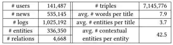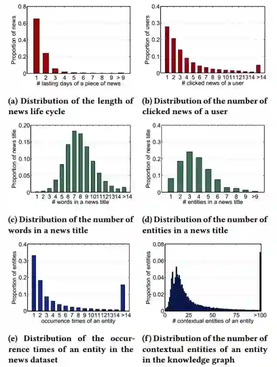 本文的数据集来自Bing新闻的服务器日志。每一段日志主要包含时间戳、用户id、新闻url、新闻标题和单击计数(0表示不点击,1表示单击)。作者收集了一个随机抽样平衡数据集,从2016年10月16日到2017年6月11日作为训练集,从2017年6月12-8月11作为测试集。使用的知识图谱数据是Microsoft Satori。新闻数据集和提取的知识图的基本统计和分布分别见表1和图3。