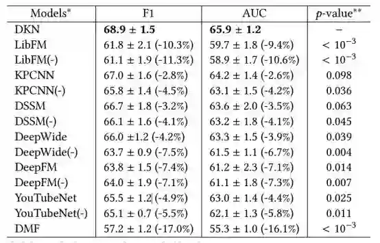 不同模型的实验结果对比如表2所示,从表中可以看出,DKN在F1-score和AUC两个指标上,都超过了作为baseline的LibFM,DeepFM,DSSM等模型。另外,针对DKN不同的配置,作者也做了对比实验,见表3。