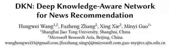 网络新闻推荐系统旨在解决新闻信息爆炸的问题,为用户提供个性化的推荐服务。一般来说,新闻语言是高度浓缩的,包含了很多知识实体和常识。然而,现有的方法很少利用这些外部知识,通常仅从语义层面(semantic level)进行表示学习,无法充分发现新闻之间潜在的知识层面(knowledge level)的联系。因此,对用户的推荐结果仅限于简单的模式,不能合理地扩展。为了解决上述问题,本文提出了一种将知识图谱表示引入到新闻推荐中的深度知识感知网络(deep knowledge-aware network ,DKN)中。