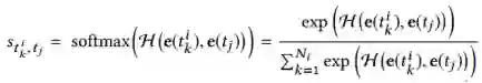 注意网络如图2左上部分所示。具体地,对于用户i点击的新闻ti和候选新闻tj,作者先将它们的嵌入连接起来,然后用一个DNNH作为注意网络和Softmax函数来计算归一化的影响力权重: