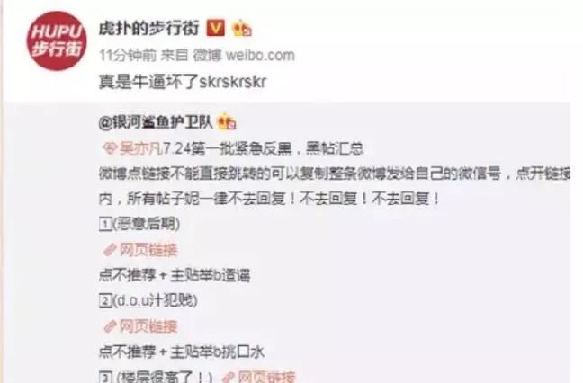 虎扑这边:一篇《出大事了!吴亦凡护卫队微博召集铁粉试图入侵虎扑,危机来临!》稿子发布之后,虎扑站内掀起第一波吴亦凡刷屏热潮,帖子的评论也都带着skr的字样。该帖目前已有超500万阅读。
