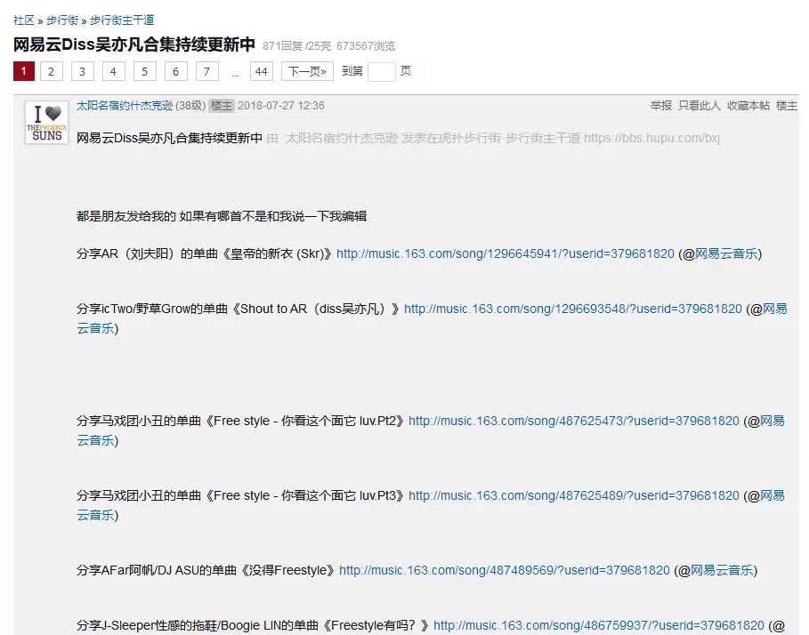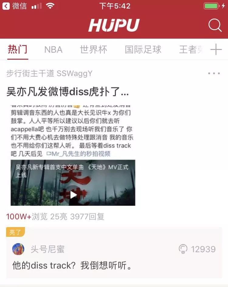 这次虎扑用户和吴亦凡粉丝刚起来,说到底是因为虎扑用户觉得吴亦凡唱功不行,这其实是一个吐槽的点。虎扑用户开始是自己录歌diss,后来索性发起了一个帖子,汇总了网易云音乐全网所有diss吴亦凡的音乐,看起来颇为震撼。