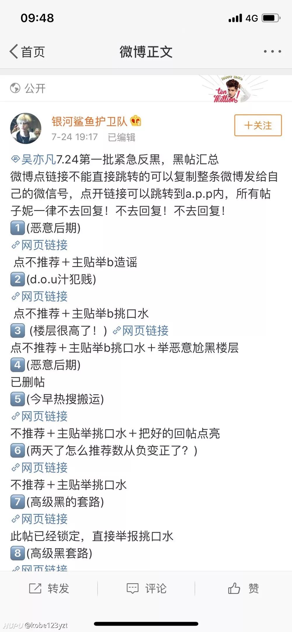 一位吴亦凡的粉丝发现了这个事,7月24日,她发布了这样一条微博,汇总了虎扑站内的她认为是在黑吴亦凡的帖子,并且号召吴亦凡的粉丝(梅格妮,意指每个你)进入APP中,举报这些帖子。