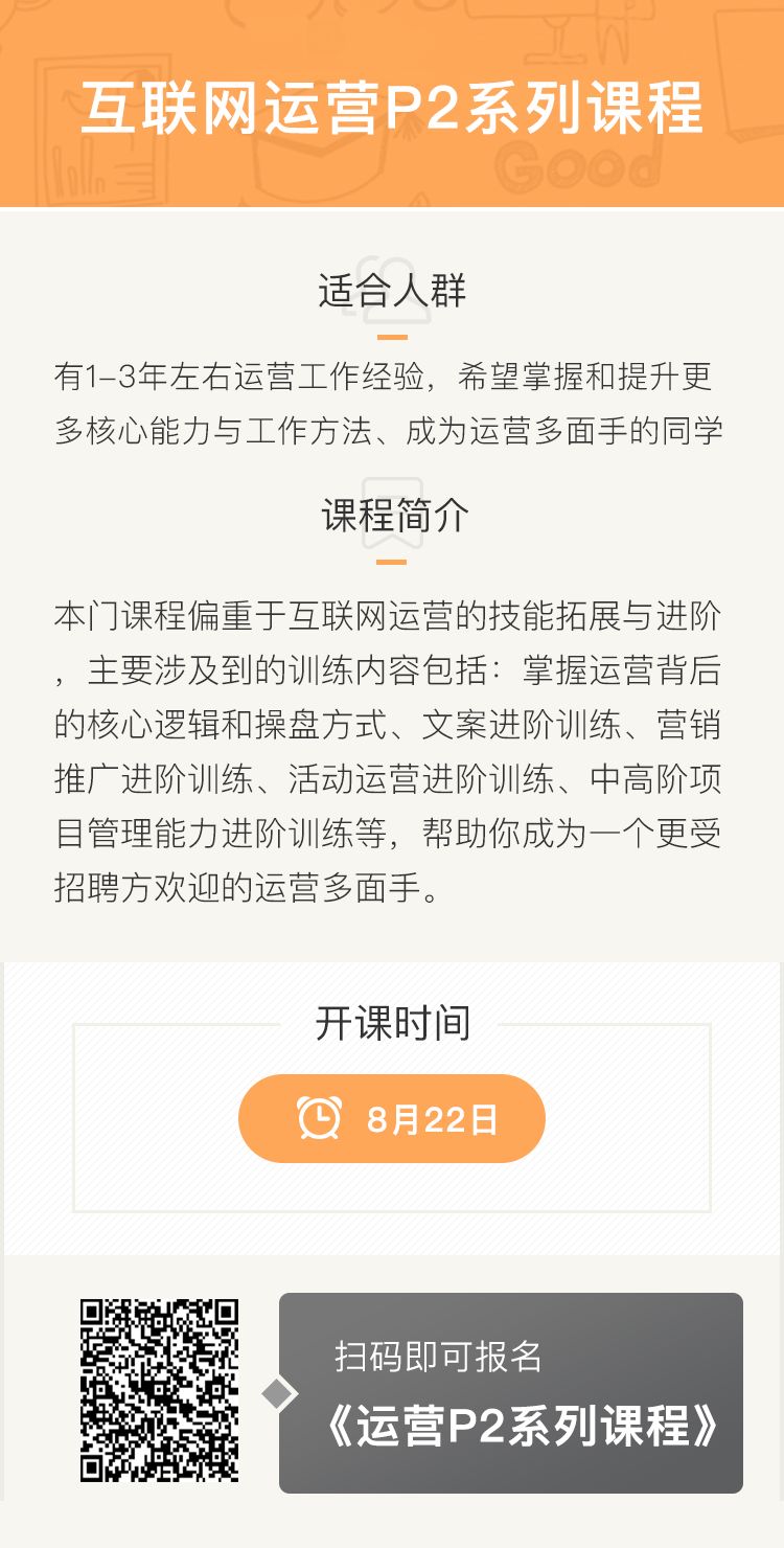 本期运营P2即将于8月22日开课,目前采用阶梯定价的方式报名,原价1699元,限额福利价1549元,名额仅剩最后30余个,想要报名的同学,赶快扫描下方海报中的二维码,前去抢占最后的优惠名额啦!
