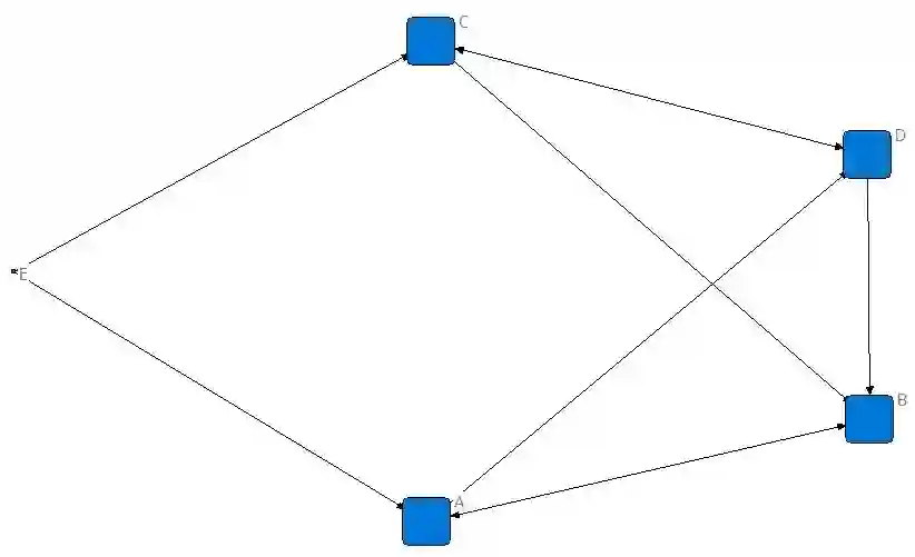 计算上图五个用户的中心度关系,可以发现A/B/C/D四个用户的局部中心度和整体中心度相等,E用户则处于边缘状态。