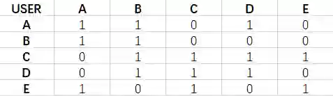 以用户A-E为例:最多可以产生25个关系(第一行代表A关注了B和D,第一列代表A被B和E关注)。