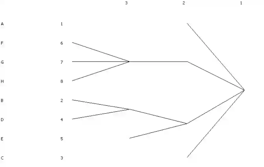 以八个用户的案例为例,进行了3次聚类,其中最左边的数字指代度中心性的排名,A用户因为有最大的中心度所以排名为1。