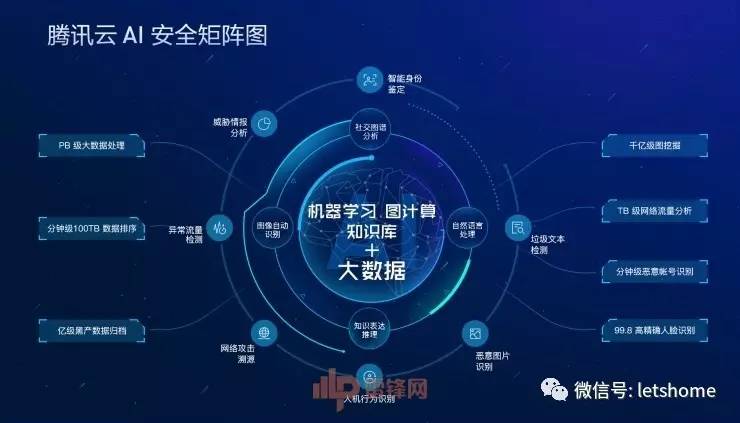 据腾讯云副总裁,腾讯云社交网络与腾讯云安全负责人黎巍介绍, 腾讯云安全整个 AI 核心就以大数据和 AI 的算法为驱动,构建应用于安全领域的包括社交图谱分析、图像自动识别、自然语言处理、知识表达推理等 AI 通用能力,形成智能身份鉴定、威胁情报分析、异常流量检测、网络攻击溯源、人机行为识别、恶意图片识别、垃圾文本检测等 7 项技术应用。