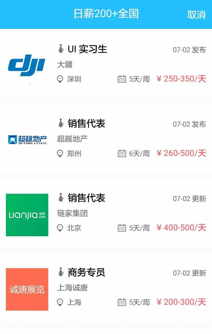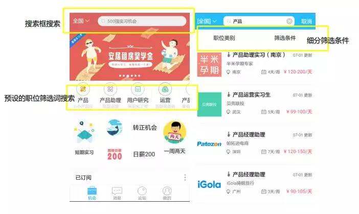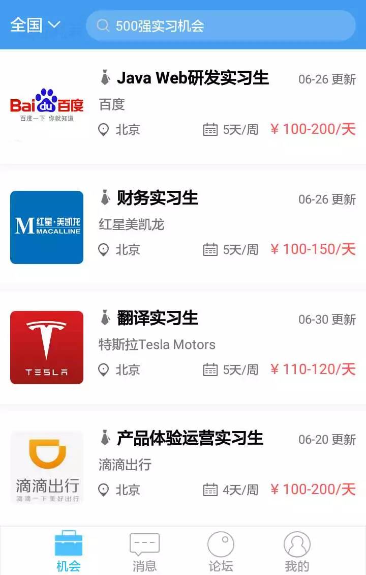 ②通过“机会”页面的“特殊实习筛选词”(短期实习、日薪200、转正机会、一周两天)直接进行筛选,适合有特殊需求的用户。比如,只想找一个一周两天的实习,做什么岗位并没有要求。