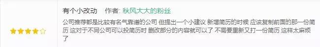 但也有用户对简历部分持异议,和上文说的一样,简历不能复制以及实习经历的时间排序问题确实有待优化。优化简历复制功能可以促进用户使用两个不同的简历(毕竟即使是再不同的两个工作岗位,用户也无需大改自己的简历,只需要局部修改即可)。