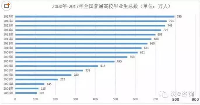 恢复高考以来,大学毕业生人数逐年增加。2014年毕业生人数突破700万,2017年则逼近800万。