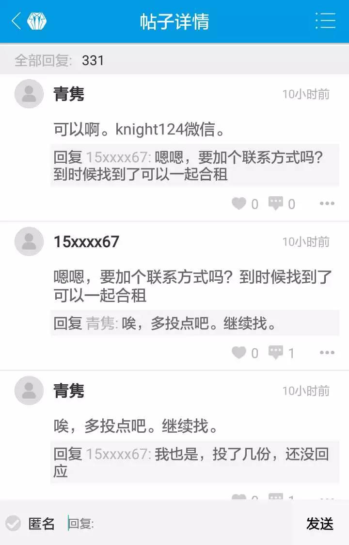 论坛的主要作用是用户之间的交流,主要内容包括经验交流、求助、合租信息、对实习僧产品的疑问等等。用户可以选择匿名发帖和回复,实名情况下也只能看到头像、昵称、签名和学校,且无法进入其主页,无太多社交性质。