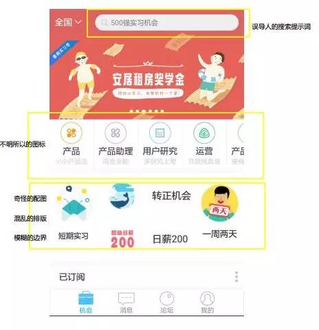 错误的搜索框提示词:搜索框的默认提示词为“500强实习机会”,然而如果你按照提示词来进行搜索,将搜索不到任何结果,体验极差