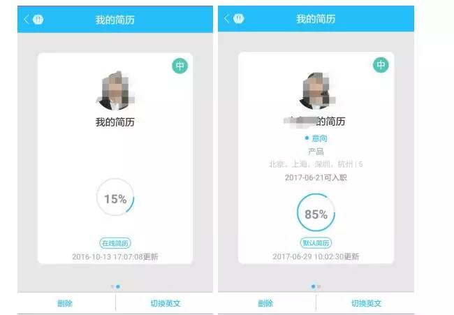 投递简历的页面在职位详情,当用户决定投递时,点击左下角的“投个简历”按钮,之后跳出简历列表(默认有2个简历),每一个简历都显示了完整度。