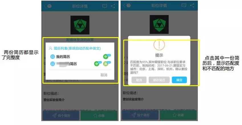 用户在投递时被告知匹配度,一方面可以让用户估算简历被通过的概率;另一方面如若匹配度低,则提示用户对简历进行修改或换一个更匹配的岗位。