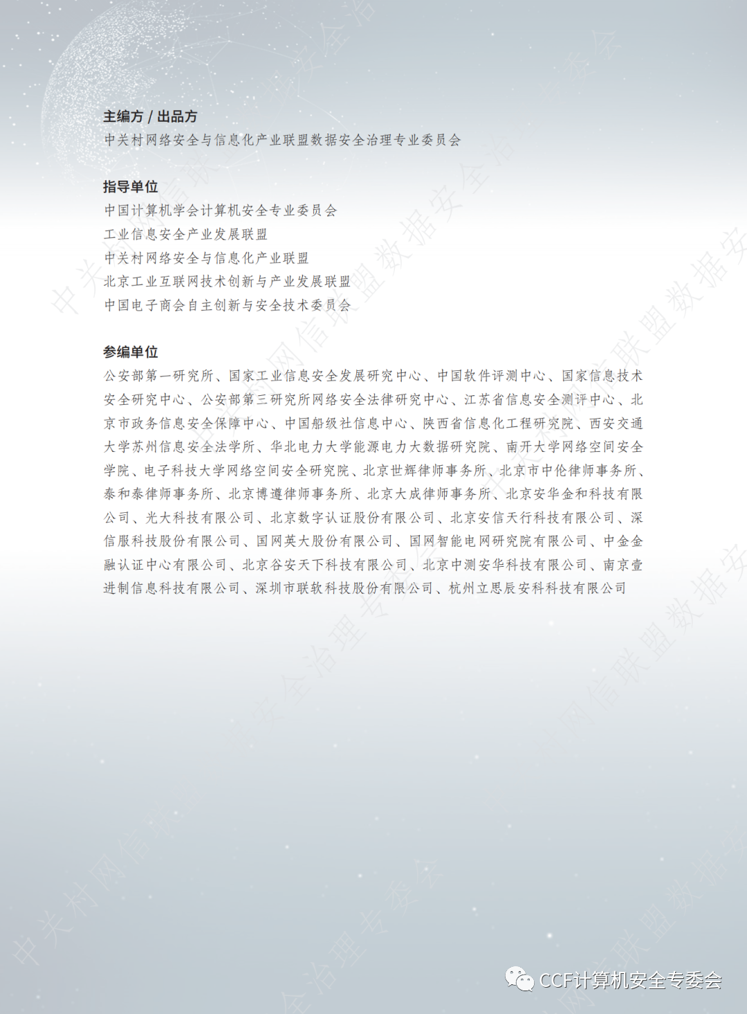 公安部第一研究所、国家工业信息安全发展研究中心、中国软件评测中心、国家信息技术安全研究中心、公安部第三研究所网络安全法律研究中心、江苏省信息安全测评中心、北京市政务信息安全保障中心、中国船级社信息中心、陕西省信息化工程研究院、西安交通大学苏州信息安全法学所、华北电力大学能源电力大数据研究院、南开大学网络空间安全学院、电子科技大学网络空间安全研究院、北京世辉律师事务所、北京市中伦律师事务所、泰和泰律师事务所、北京博遵律师事务所、北京大成律师事务所、北京安华金和科技有限公司、光大科技有限公司、北京数字认证股份有限公司、北京安信天行科技有限公司、深信服科技股份有限公司、国网英大股份有限公司、国网智能电网研究院有限公司、中金金融认证中心有限公司、北京谷安天下科技有限公司、北京中测安华科技有限公司、南京壹进制信息科技有限公司、深圳市联软科技股份有限公司、杭州立思辰安科科技有限公司
