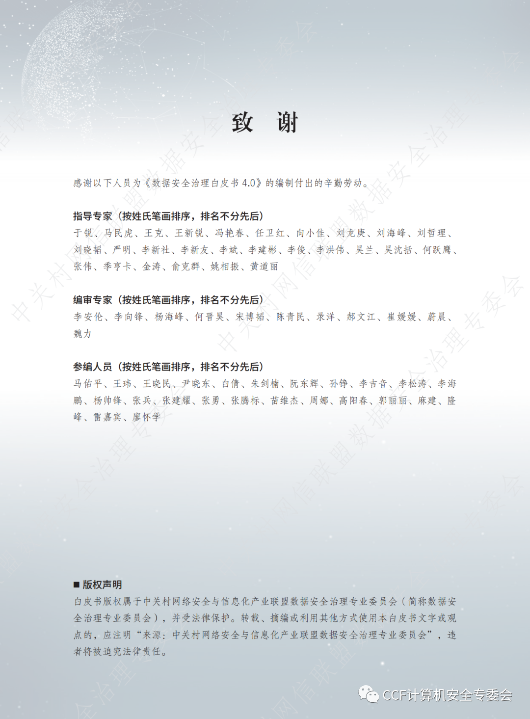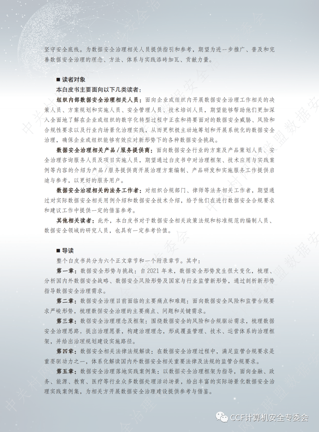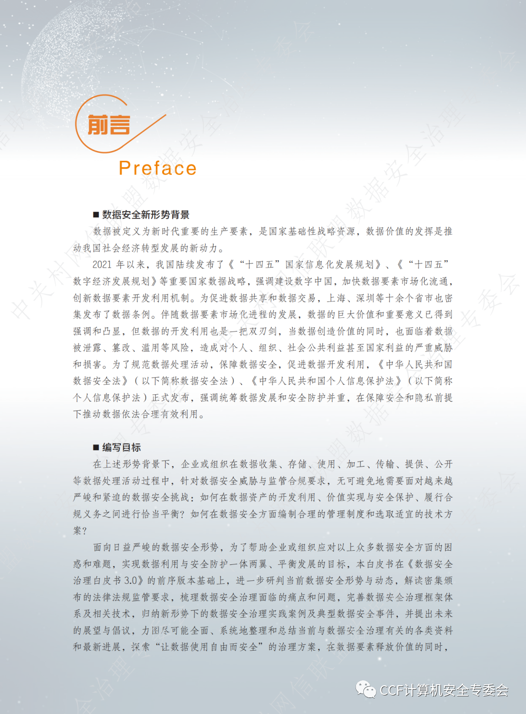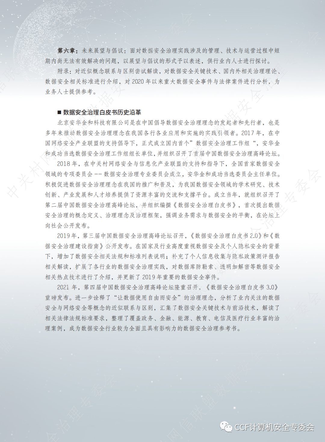 《数据安全治理白皮书1.0》是由中关村网络安全与信息化产业联盟数据安全治理专委会的成员单位们于2018年5月第二届中国数据安全治理高峰论坛上正式发布,也是国内首个关于数据安全治理概念、理论和技术介绍的普及类技术文档;2019年到2021年,白皮书2.0、3.0版本相继发布,整理并收录更多前沿的理论、技术、案例等内容,解读相关法律法规标准要求,推广与宣传数据安全体系化建设、持续改善的建设思路,使数据安全治理逐步成为数据安全建设的共识,《数据安全治理白皮书》也成为数据安全行业较为全面且具有影响力的数据安全治理参考书。