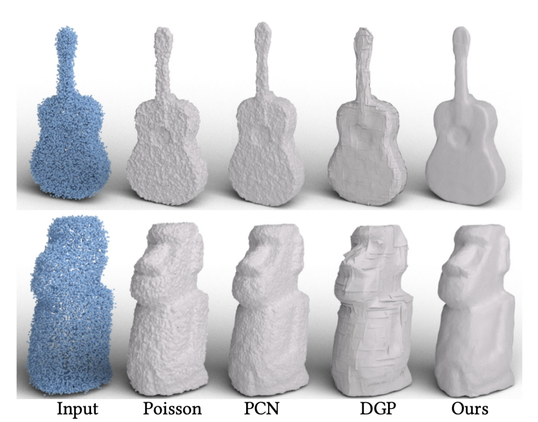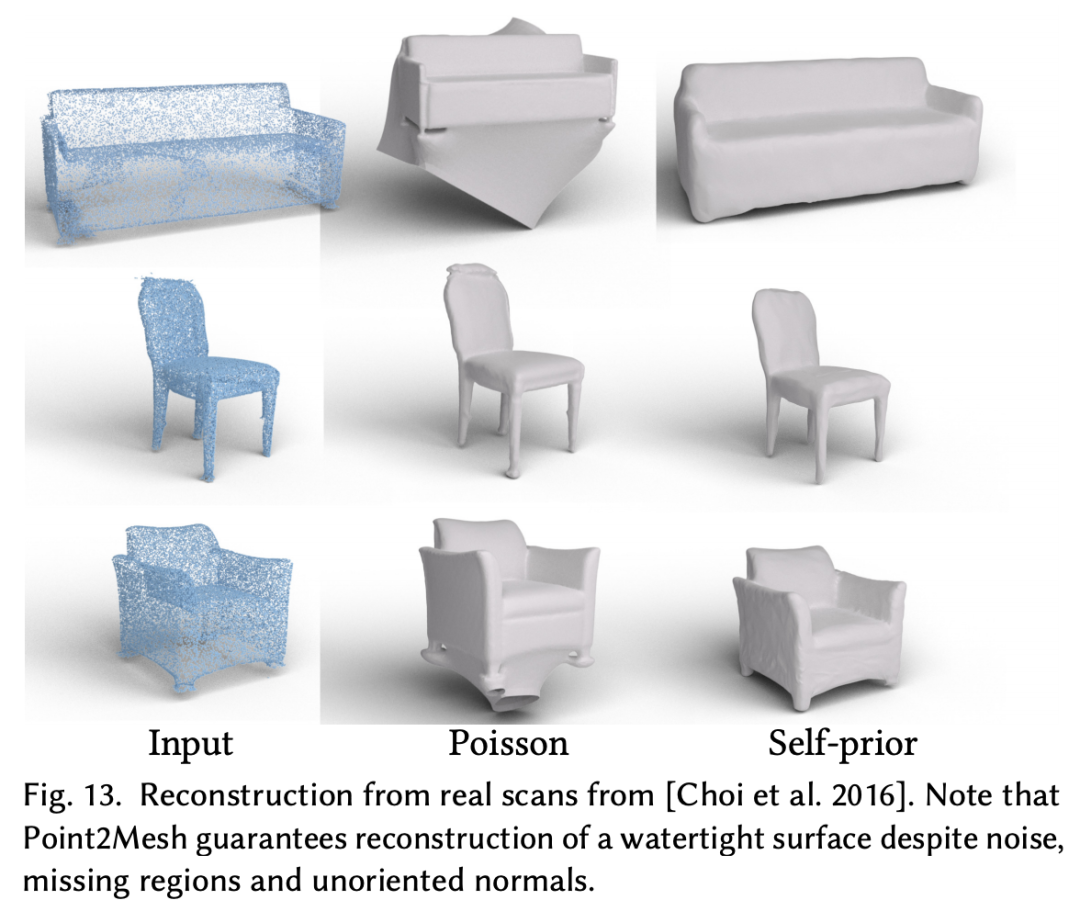 图 2:使用平滑 prior 从有缺失区域的点云中重构完整的网格,该方法会忽略整体形状特征。