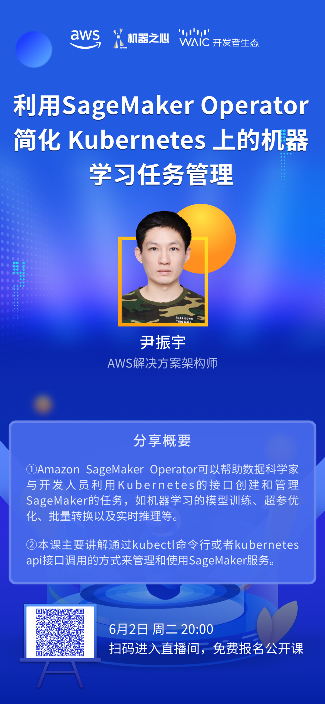 6 月 2 日 20:00,AWS解决方案架构师尹振宇将带来第 3 课,详解如何利用SageMaker Operator简化Kubernetes 上的机器学习任务管理。