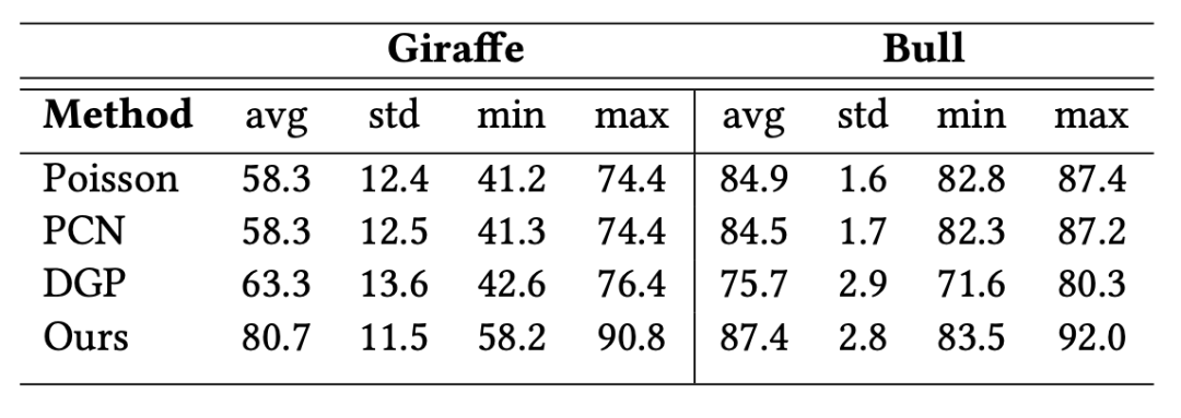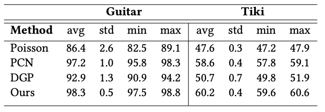 表 2:形状完成度结果比较(F-score 越高越好)。
